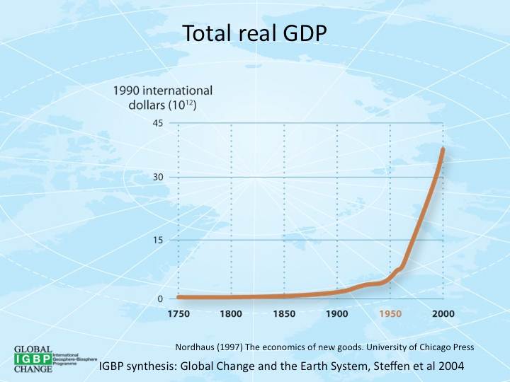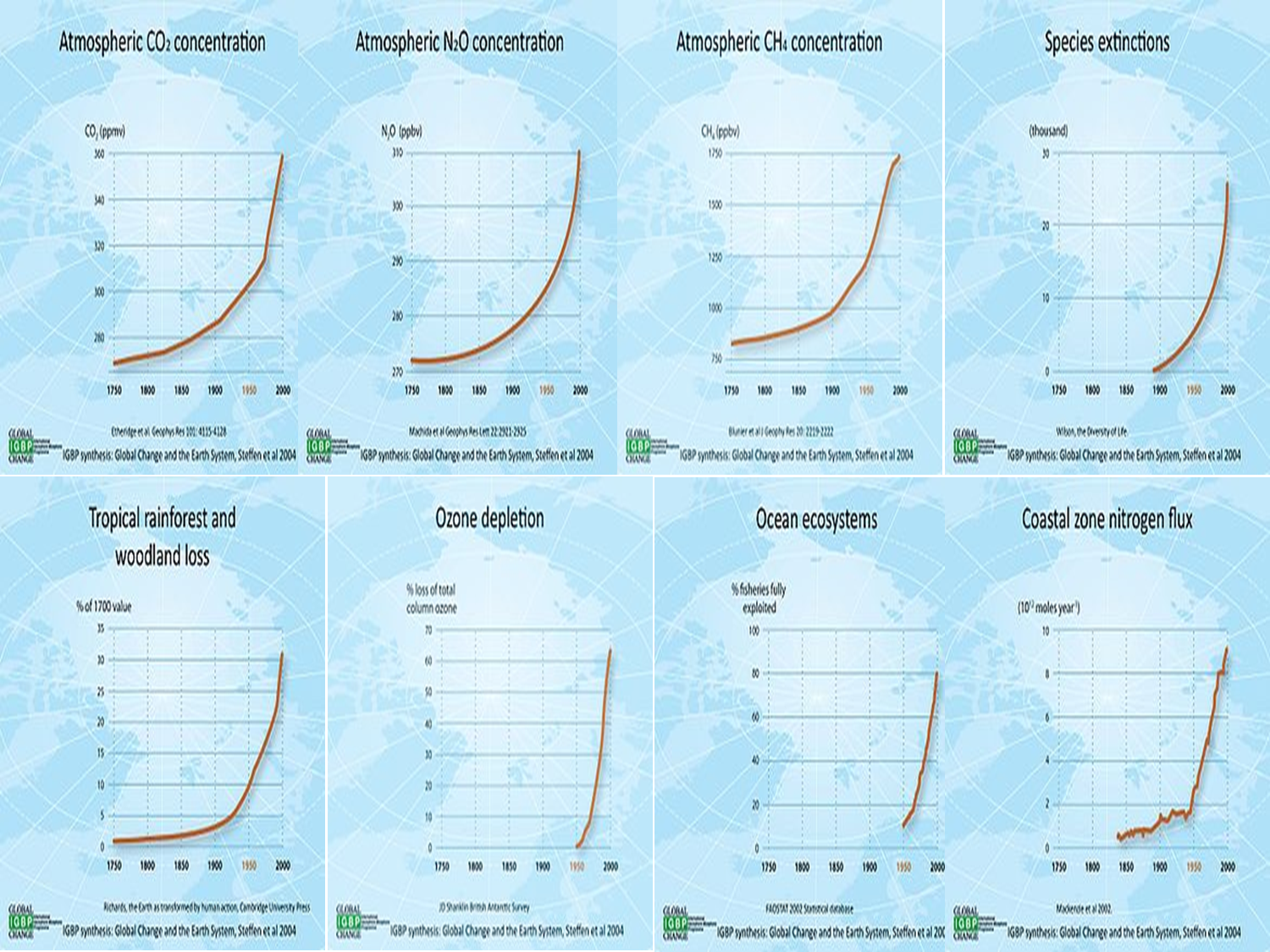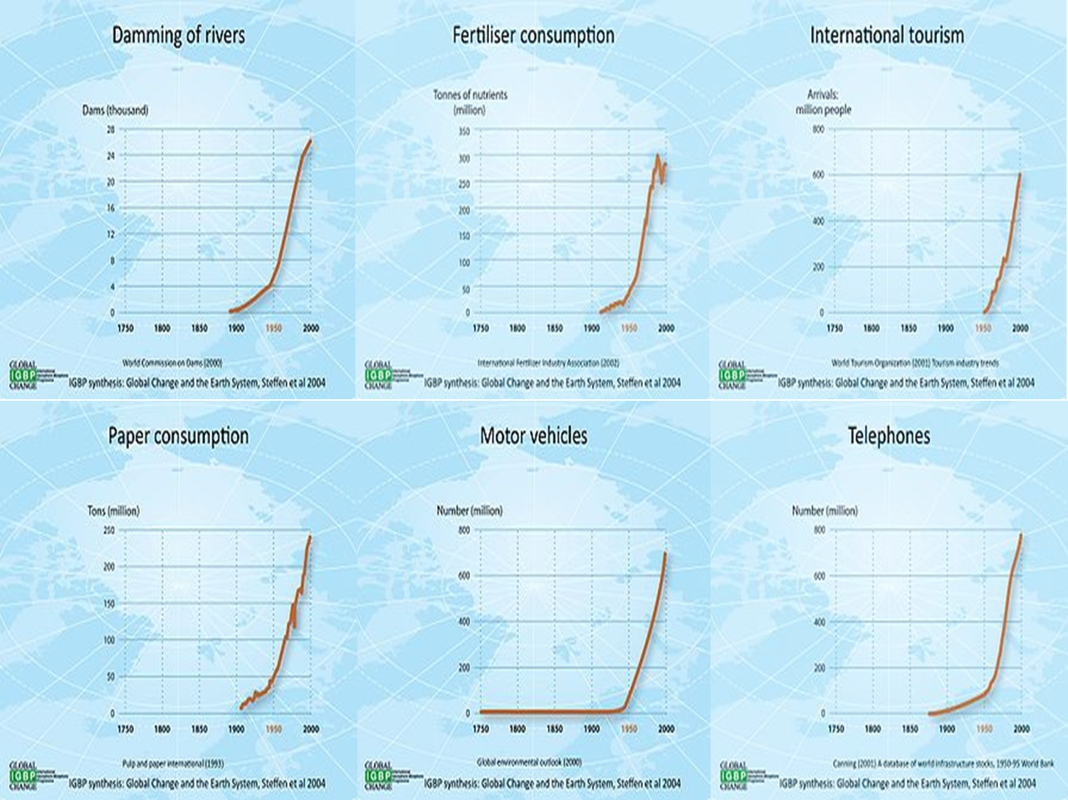 En la posguerra el sistema capitalista ingresó en una fase de expansión que se inició en EE.UU. cuya sociedad se transformó en el modelo de modernidad y prosperidad, basado en un consumismo desenfrenado. A partir de la década del año 1950 la mayor parte de las actividades de producción y consumo comenzaron a crecer exponencialmente. Década que bien puede ser identificada como un punto de inflexión en cuanto al aumento de las actividades humanas y de los impactos sobre el ambiente.