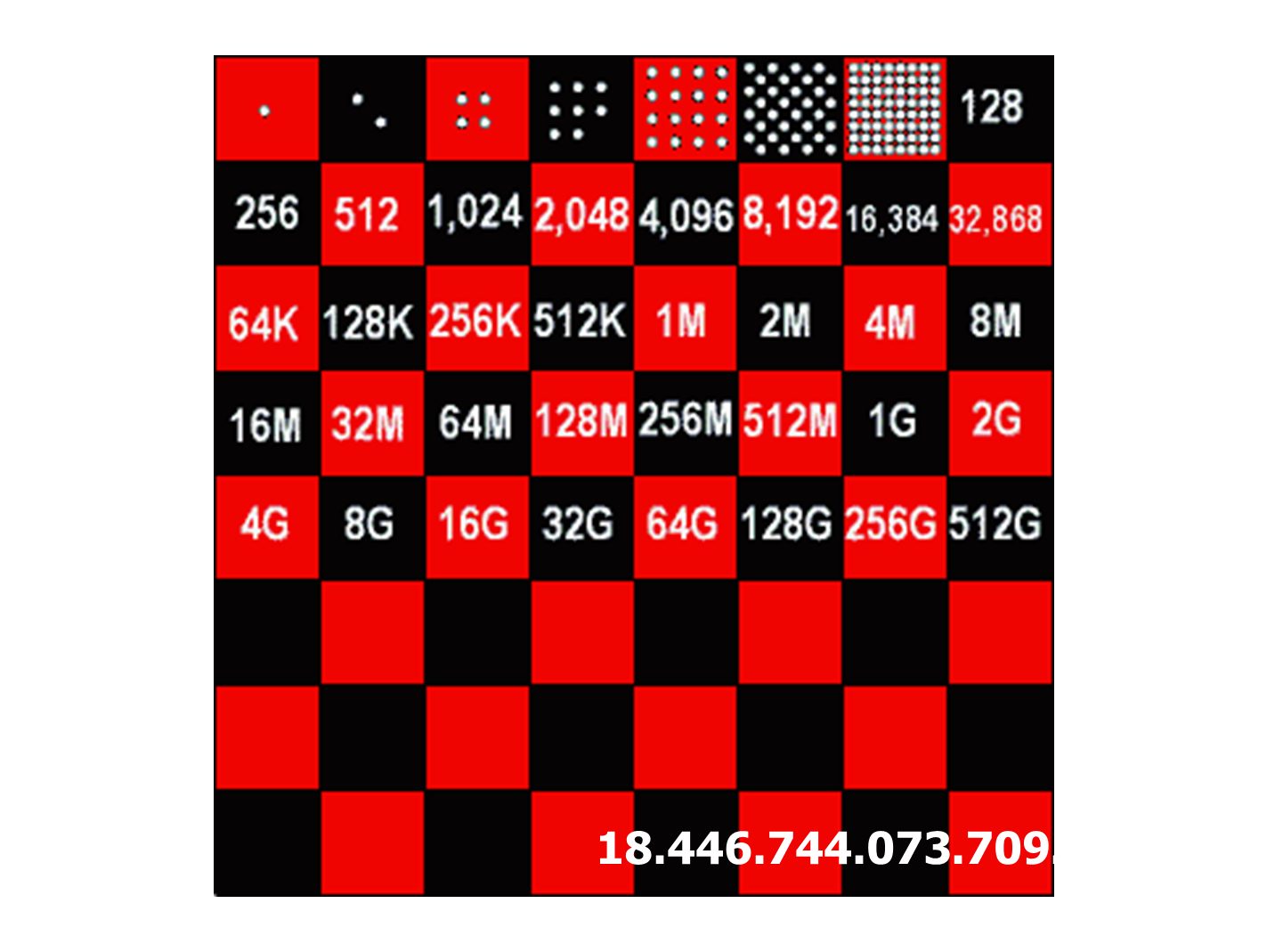 Por qué deleitó tanto a un rey la invención de un juego llamado «muerte al rey» es un misterio, pero, según la historia, se sintió tan complacido que pidió al gran visir que determinara su recompensa por tan maravillosa invención. Éste ya tenía la respuesta preparada; era un hombre modesto, explicó al shah, y sólo deseaba una modesta gratificación. Señalando las ocho columnas y las ocho filas de escaques del tablero que había inventado, solicitó que le entregase un solo grano de trigo por el primer escaque, dos por el segundo, el doble de eso por el tercero y así sucesivamente hasta que cada escaque recibiese su porción de trigo. No, replicó el rey, era un premio harto mezquino para una invención tan importante. Le ofreció joyas, bailarinas, palacios. Pero el gran visir, bajando la mirada, lo rechazó todo. Sólo le interesaban aquellos montoncitos de trigo. Así que, maravillado en secreto ante la humildad y la moderación de su consejero, el rey accedió.