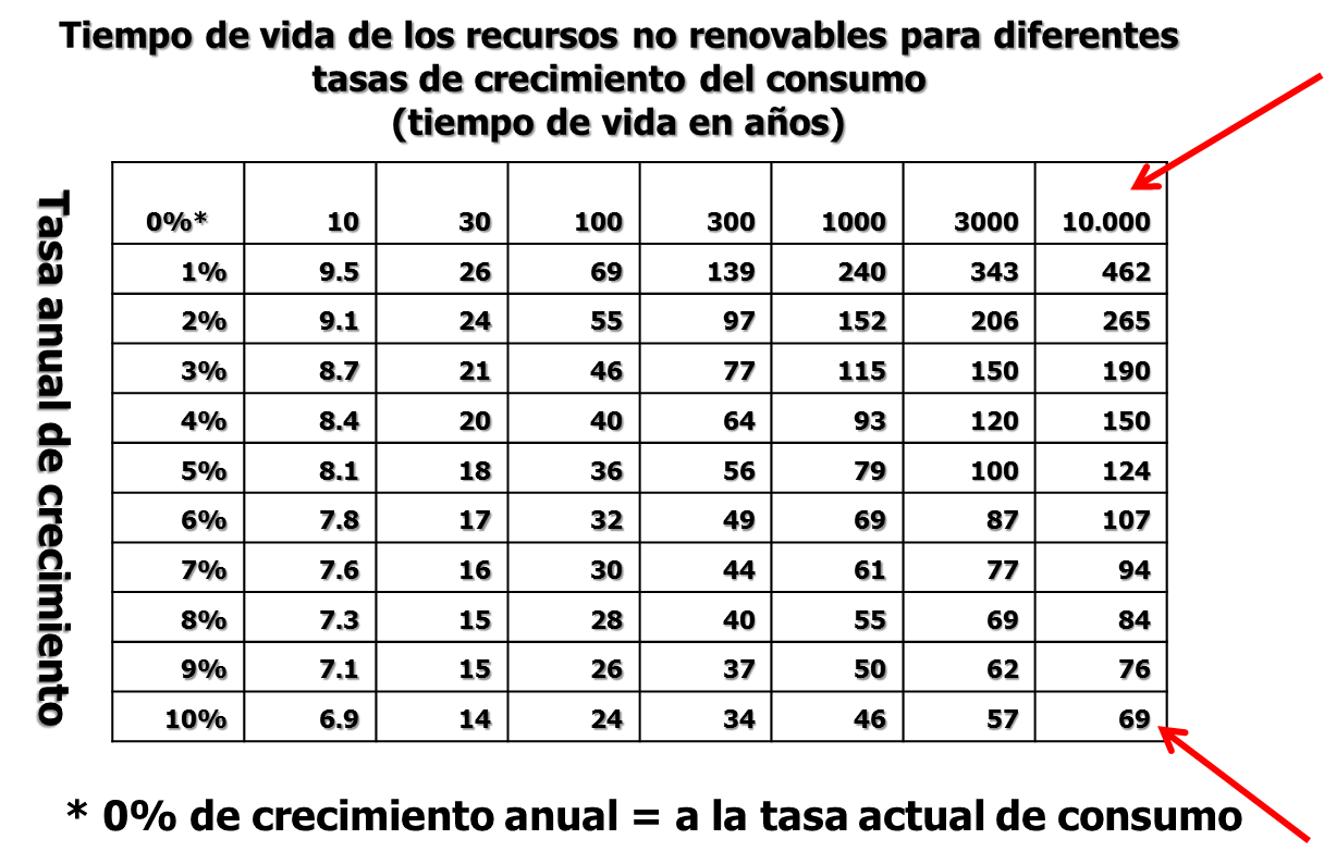 Un recurso no renovable que a la tasa actual de consumo tendría 10.000 años de tiempo de vida, con una tasa anual de crecimiento del 10% reduce su tiempo de vida a tan solo 69 años.