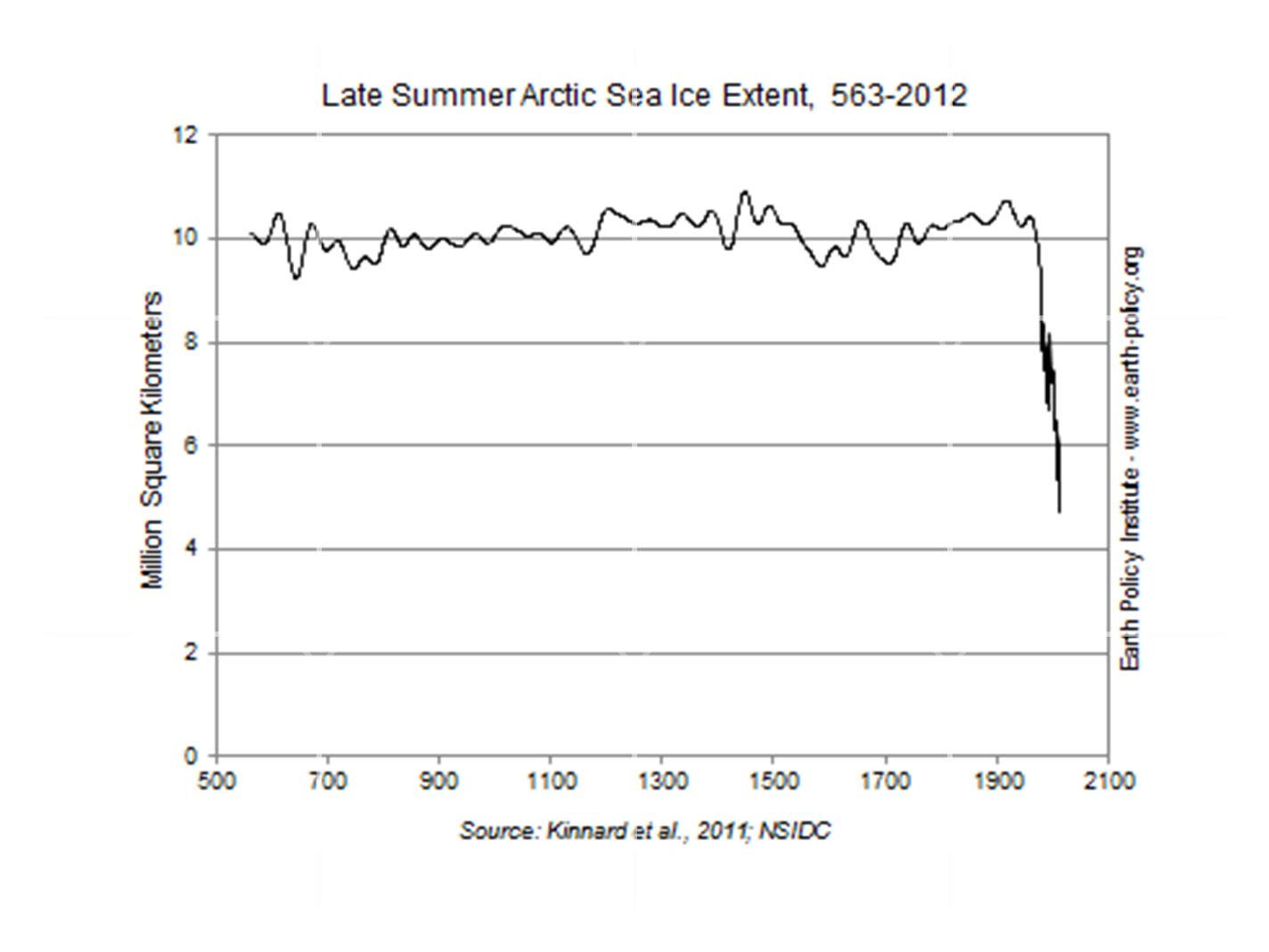 Los hielos del Ártico, por ejemplo, están experimentando un decrecimiento exponencial. Comparando recientes temporadas de deshielo con los registros históricos que abarcan más de 1400 años vemos que los hielos del mar Ártico se encuentran en caída libre. Muchos científicos creen que el Océano Ártico quedará libre de hielo en verano en una o dos décadas más, y algunos dicen que esto podría ocurrir antes (estimando el 2016). La última vez que el Ártico quedó completamente libre de hielo en verano fue hace 125.000 años.