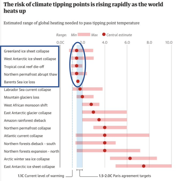 [2] Armstrong McKay D. et al. (2022). Exceeding 1.5°C global warming could trigger multiple climate tipping points. SCIENCE. 9 Sep 2022 Vol 377