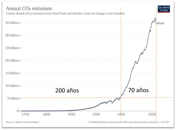 En el siguiente gráfico se puede apreciar la manera en la que evolucionaron las emisiones de CO2, particularmente, a partir de la década de 1950. Recordemos que ya en 1950 la industria petrolera sabía del peligro que significaba el crecimiento de las emisiones de GEI´s, pese a lo cual, es a partir de ese año que da inicio su crecimiento exponencial.