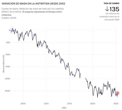 Los datos satelitales recopilados por misiones como GRACE y GRACE‑Follow On de la NASA muestran que, desde 2002, tanto Groenlandia como la Antártida han perdido masa de hielo de manera sostenida. Groenlandia registra una pérdida promedio cercana a los 266 mil millones de toneladas anuales, mientras que la Antártida pierde alrededor de 135 mil millones de toneladas por año en el mismo período, cifras que constituyen una contribución significativa al aumento del nivel del mar.