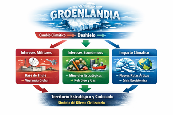 Además de sus consecuencias físicas —como la contribución al aumento del nivel del mar y la alteración de sistemas oceánicos y climáticos a escala planetaria—, el acelerado deshielo de Groenlandia despliega implicancias geopolíticas de gran alcance. La retirada del hielo no solo transforma un territorio hasta hace poco inaccesible, sino que reconfigura su valor estratégico, expone recursos críticos, acelera dinámicas extractivas y tensiona los marcos de soberanía existentes. Groenlandia se convierte así en un espacio donde el cambio climático actúa como catalizador de disputas militares, económicas y políticas que exceden largamente el ámbito ambiental.