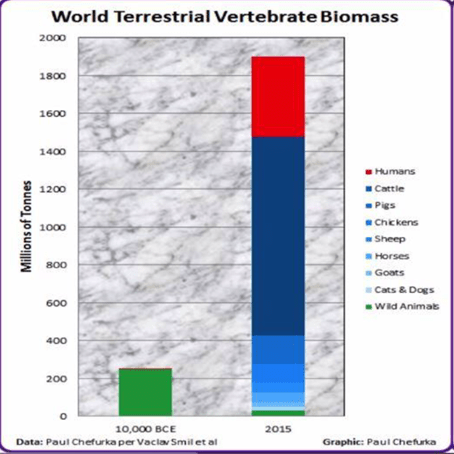 Para comprender la magnitud de este proceso es necesario cambiar de escala. Al observar la composición de la biomasa de vertebrados terrestres a nivel planetario, emerge un patrón inequívoco: durante milenios, la fauna silvestre constituía la mayor parte, mientras los humanos y sus animales domesticados ocupaban un lugar marginal. Hoy, esa relación se ha invertido por completo.