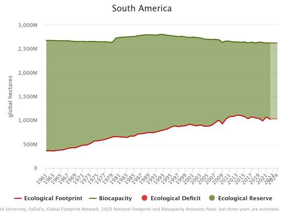 Durante las últimas tres décadas, Sudamérica ha conservado superávit ecológico agregado, aunque con reducción progresiva del margen disponible.