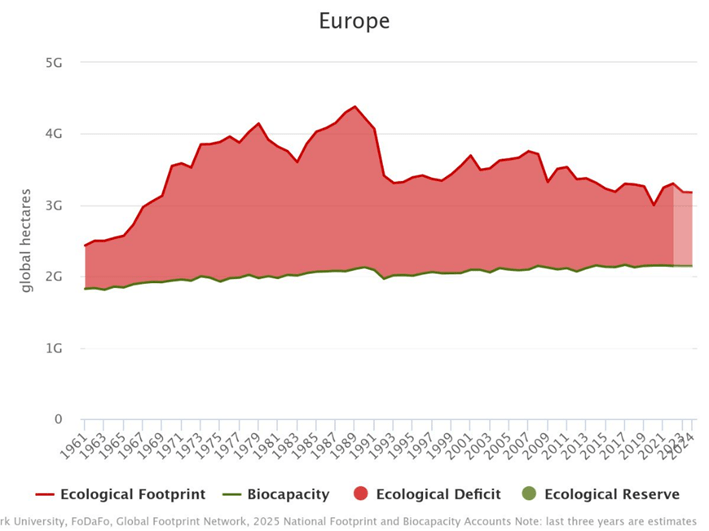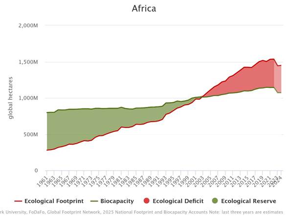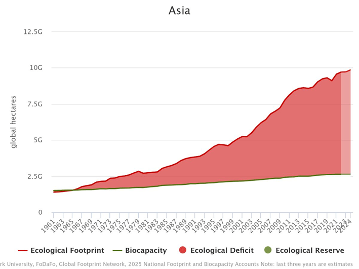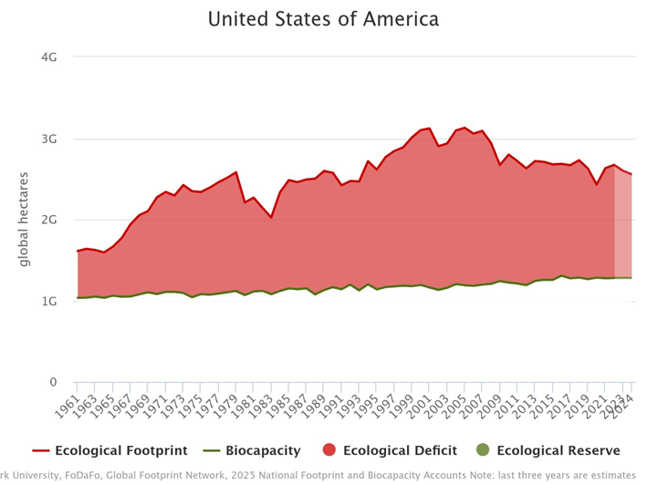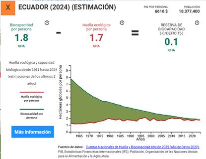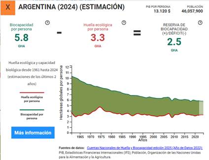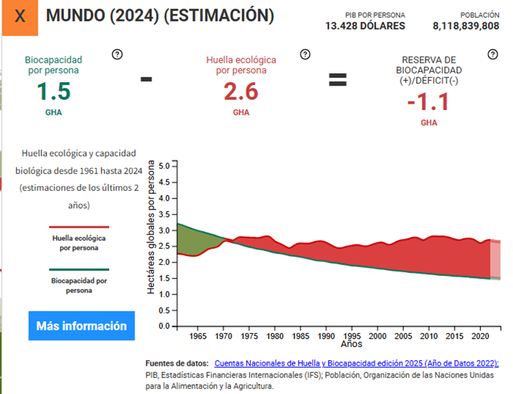 A escala global, la humanidad vive en sobregiro ecológico desde hace décadas: la Huella total excede la Biocapacidad del planeta. Cada año se consume más de lo que la biosfera puede regenerar en el mismo período, lo que implica liquidación de capital natural y acumulación de pasivos ambientales.