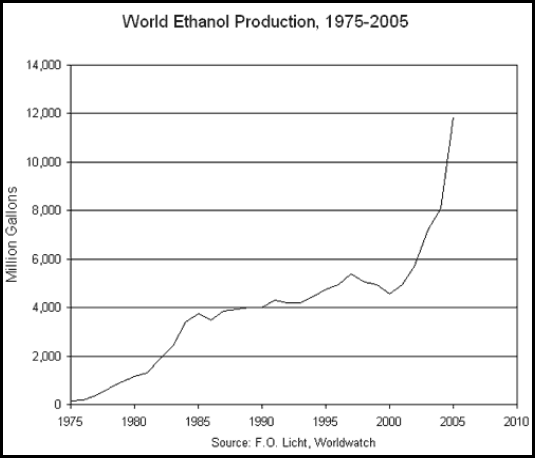 En tal escenario emerge una nueva fuente de demanda: la producción de etanol para combustible, que con su actual precio en EE.UU., que duplica su costo de producción, ha transformado la conversión de productos agrícolas en combustible para su empleo en automóviles en un negocio enormemente provechoso y ello se ha traducido en una desenfrenada construcción de destilerías de etanol en diferentes regiones agrícolas de los EE.UU.