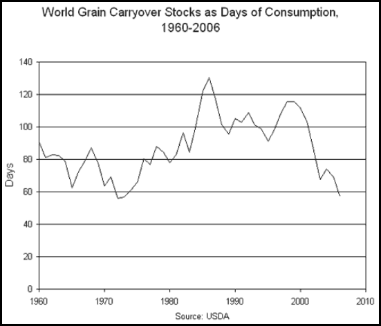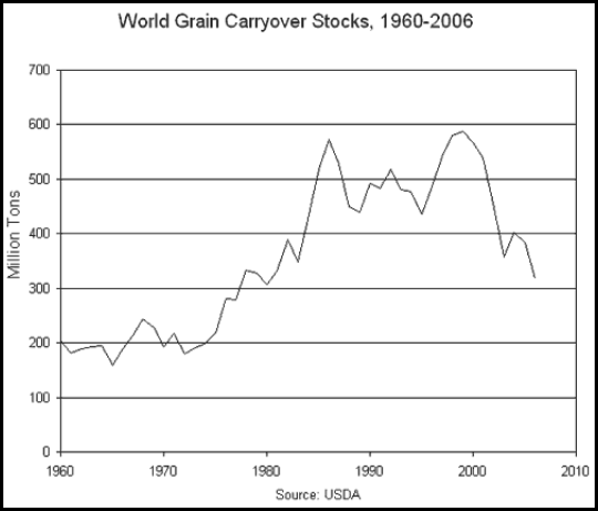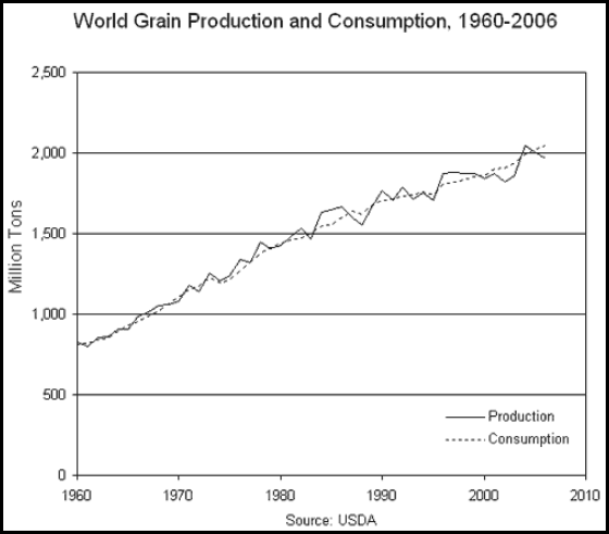 Si se analiza el mercado mundial, se puede constatar que en los últimos siete años, la cosecha mundial de granos no ha alcanzado a satisfacer la demanda para su empleo en la producción de alimentos. Así por ejemplo, en 2006, el déficit alcanzó los 73 millones de toneladas, equivalente a un 4%.